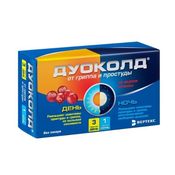Розничная цена от 300. Дуоколд порошок для приготовления раствора для приема внутрь вкус клюква - это комбинированный лекарственный препарат, действие которого обусловлено входящими в его состав компонентами, оказывает жаропонижающее, противовоспалительное, обезболивающее, противоаллергическое, ангиопротекторное и сосудосуживающее действия. Устраняет симптомы «простуды». Сужает сосуды носа, устраняет отек слизистой оболочки носа. Применяется для симптоматического лечения инфекционно-воспалительных заболеваний: ОРВИ (острая респираторная вирусная инфекция), в том числе грипп и «простуда», сопровождающиеся повышением температуры тела, ознобом, головной болью, болями в суставах и мышцах, насморком, заложенностью носа, чиханием и болями в горле и пазухах носа. Содержимое пакетика растворить в одном стакане (200 мл) горячей, но не кипящей, воды. Употребить сразу после растворения. Перед употреблением раствор размешать. В упаковке 3 пакетика порошка для приготовления раствора для приема внутрь «День» и 1 пакетик порошка для приготовления раствора для приема внутрь «Ночь».