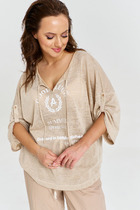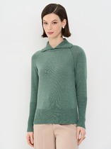 Джемпер-поло прямого кроя. Выполнен из фактурного трикотажа голубого цвета. Воротник отложной. Застёжка пуговички на планке. Рукав втачной, короткий. Длина спинки 54 см. Длина рукава от линии втачивания 21 см