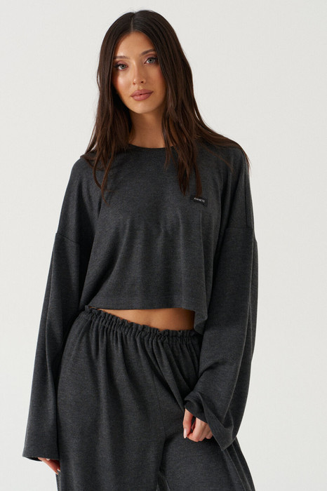 Джемпер прямого силуэта, укороченный, широкий. Выполнен из трикотажного полотна в графитовом оттенке. Характеристика: горловина круглая обработана притачной планкой. На полочке брендированная нашивка. Спинка цельнокроеная. Рукав одношовный, втачной. Низ рукава и джемпера обработан на распошивальной (плоскошовной) машине. Длина рукава от горловины 75 см, длина джемпера по спинке 44 см.