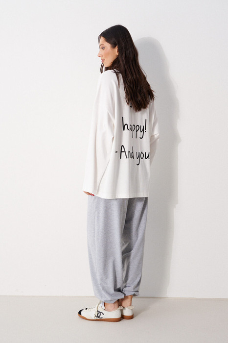 Джемпер прямого свободного кроя,выполнен из трикотажного полотна белого цвета. Характеристики: прямой крой, овальный вырез горловины, горловины из довяза, спинка цельнокроеная, Принт "I'm happy! And you?", спущенное плечо, вточной длинный рукав. Длина по центру спинки 70 см, длина рукава от края горловины 76см.