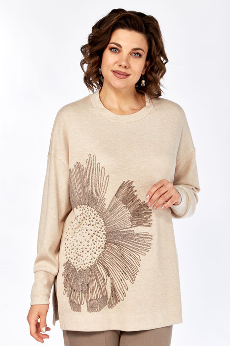 Джемпер женский, свободного кроя, изготовлен из трикотажного полотна. Горловина круглой формы. На полочке — вышивка. Спинка цельнокроенная. Рукава спущеные, с манжетам по низу. В боковых швах разрезы.