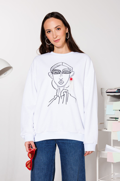 Джемпер с контрастной вышивкой — отличная вещь для весеннего гардероба. Он окутает теплом и добавит свежести в повседневный образ.  Для этой модели мы выбрали плотный хлопок без начеса. Длина - 64 см.