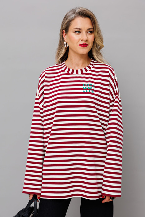 Лонг оверсайз прямого кроя. По переду и спинке выполнен дизайнерский принт "cool moms club". Ткань полосатая двухнитка. Длина - 70 см.