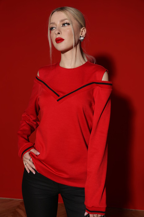 Джемпер свободного объёма, оригинального кроя, с имитацией топа и открытыми плечами. Горловина круглая, по спинке застежка на петлю и пуговицу Отделка горловины джемпера и манжеты выполнены из довязов в контрастном цвете.