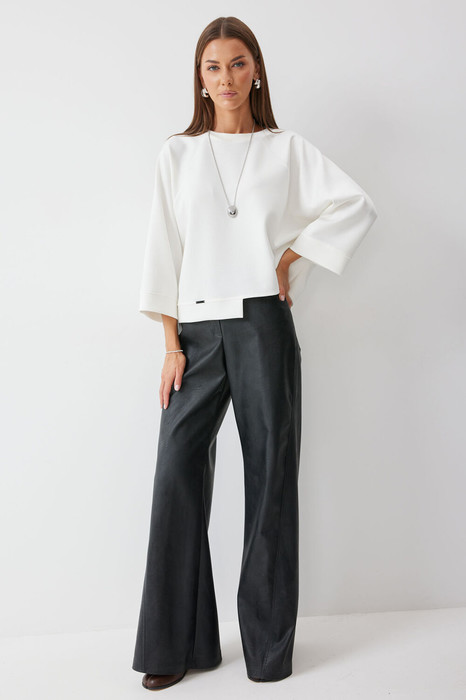 Ассиметричный джемпер прямого силуэта из трикотажного полотна. Горловина-лодочка. Рукав цельнокроеный с декоративным подрезом. По низу джемпера декоративный пояс с пришивным декором.