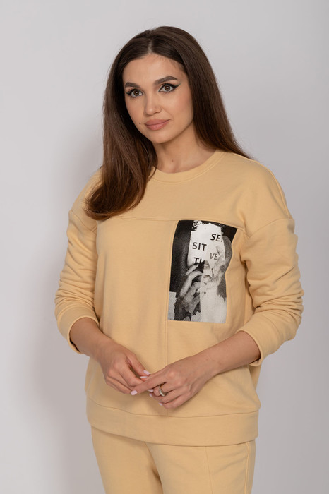 Джемпер женский свободного силуэта со спущенными плечами. По переду подрезы. Горловина круглая. Рукава одношовные втачные на манжете. Украшает джемпер печать.