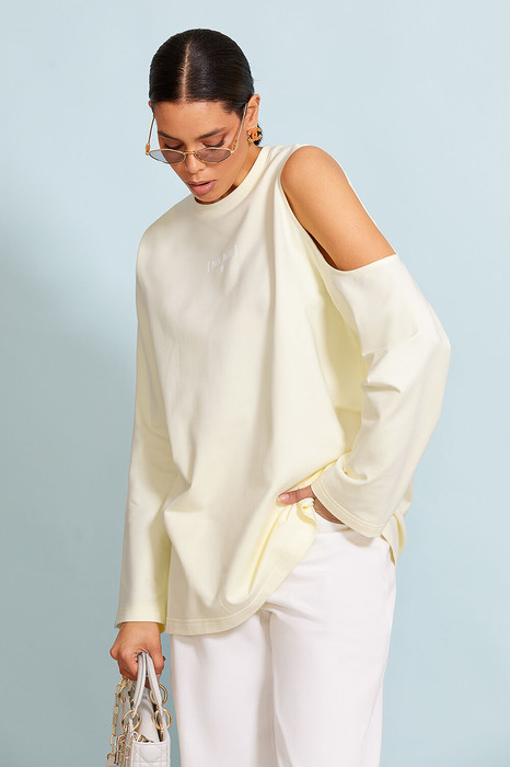Перед и спинка прямые. Спущенная линия плеча. Втачной длинный прямой рукав. Круглая горловина с притачной планкой из отделочной ткани. На левом плече декоративный вырез. На полочке изделия авторский принт. В боковом шве –дизайнерский флажок.