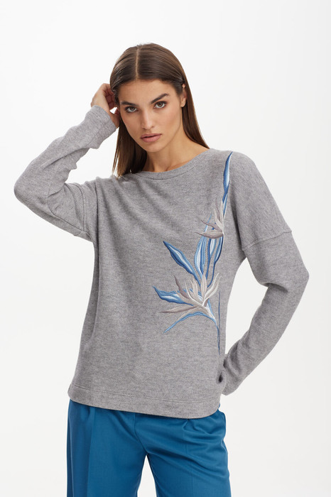 Стильный универсальный мягкий свитшот из нежного трикотажа. Модель свободной формы полуприлегающего силуэта, с овальным вырезом горловины, со спущенным плечом. Горловина обработана планкой из основной ткани. Перед модели декорированы дизайнерской вышивкой.