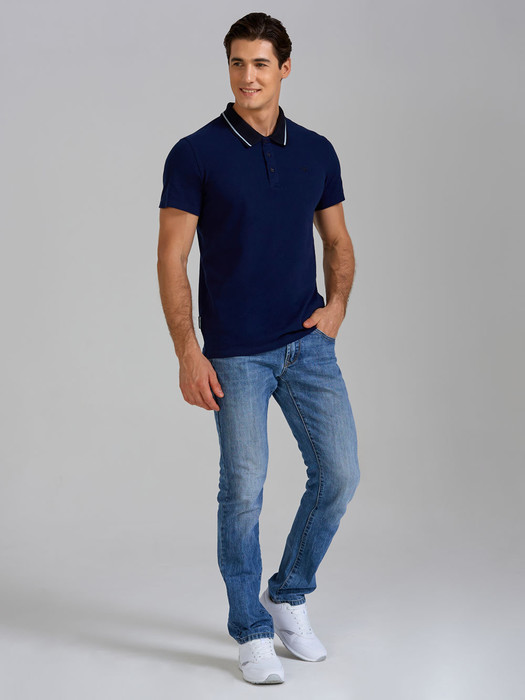 Футболка-поло из хлопкового полотна "пике". Классическая модель поло с короткими рукавами. Воротник и манжеты рукава выполнены из трикотажной рибаны темно-синего цвета с белой полосой. На полочке застежка-планка на пуговицах. На полочке вышивка "R". По низу футболки в боковых швах выполнены разрезы, обработанные тесьмой.