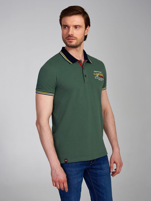 Футболка-поло из хлопкового полотна "пике". Классическая модель поло с короткими рукавами. Воротник и манжеты рукава выполнены из трикотажной рибаны темно-синего цвета с бело-желтой полосой. На полочке застежка-планка на пуговицах. На нижней планке и по горловине настрочена контрастная киперная тесьма. На полочке вышивка "YACHT CLUB ALBATROSН Yahting ATLANTIC VOYAGE SAILING". На левом рукаве вышивка "ALBATROS","Yahting". По низу футболки в боковых швах выполнены разрезы, обработанные киперной тесьмой. С правой стороны полочки, по низу настрочен жаккардовый "флажок" с логотипом.