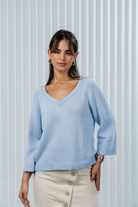Джемпер прямого силуэта связан из пряжи, в состав которой входит 50% хлопка,50% ПАН. Джемпер очень мягкий и приятный к телу, вывязан переплетением кулирная гладь. Рукав реглан прямой, длиной 7/8.V-образная горловина обработана цельновывязанной бейкой. Низ изделия, низ рукава связаны переплетением ластик 2*2