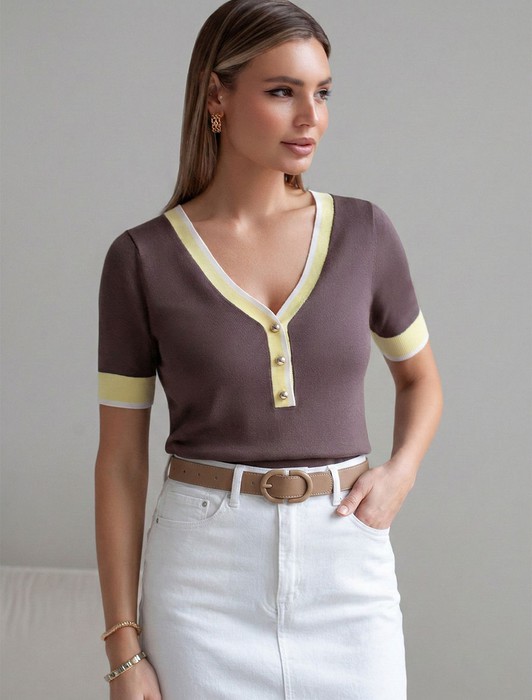 Состав: 80%Вис 20%ПАЛегкий джемпер кофейного цвета с V-вырезом идеально подходит на весну и лето. Для производства изделия использована пряжа сердечникового прядения — когда нейлоновая нить (основа) обвивается вискозой. Вискоза обеспечивает приятную тактильность и гигроскопичность, а нейлон предотвращает растяжение и повышает устойчивость к пилингуемости. Тонкая вязка дарит приятный комфорт и ощущение свежести в теплую погоду. Полуприлегающий крой подчеркивает силуэт, а универсальная длина позволяет сочетать джемпер с разными элементами гардероба. V-вырез с пуговицами подчеркивает зону декольте и визуально вытягивает шею, делая фигуру более изящной. Контрастная отделка добавляет стильный акцент, создавая выразительный образ. Джемпер отлично смотрится на больших размерах благодаря продуманному крою и полуприлегающему фасону. Этот джемпер с коротким рукавом станет незаменимой частью гардероба в сезоны, когда хочется легкости и элегантности одновременно. Лаконичный дизайн обеспечивает простоту комбинирования с другими вещами и будет универсальной базой для создания разнообразных комплектов — от офисного до непринужденного городского стиля.