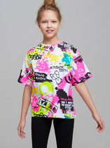 Футболка оверсайз для девочки подростка. Модель выполнена из эластичного хлопкового трикотажа джерси. На груди расположен крупный принт. Горловина круглая, обработана эластичным рибом.