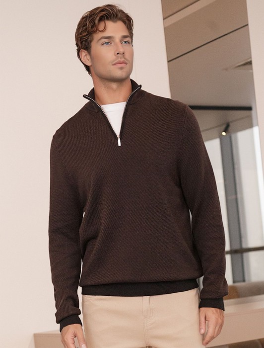 Состав: 55%Хлопок 45%ПАН (акрил) Параметры модели на первом фото: Рост 190, бюст 108, талия 87, бедра 104Черно-коричневый джемпер с длинными рукавами выполнен из мягкой хлопковой пряжи с добавлением акрила. Высокий воротник застегивается молнией. За счет переплетения светлых и темных нитей получилась фактурная меланжевая модель, которая, отлично держит тепло и почти не ощущается на теле. Сочетается с футболками, денимом и с чиносами, любой обувью.