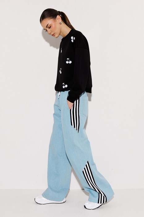 Брюки-джинсы, комбинированные, прямого силуэта. На притачном отстроченном поясе с втянутым в него декоративным шнурком. Перед и спинка выполнены из джинса. По переду карманы в шве с наклонным входом. По спинке накладные карманы с нашивкой "BUTER". По бокам отрезной бочок, комбинированный из замшевой отделочной ткани, по которой отстрочено 3 узких лампаса и центральная вставка из джинса.