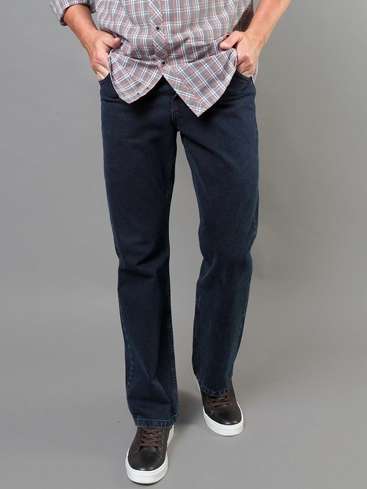 Мужские классические джинсы с пятью карманами. Посадка Comfort fit (свободные по бедру), высокая талия, широкие в колене и по низу. Застежка на молнии. Выполнены из традиционной хлопковой  ткани denim, цвет ткани Blue/Black (лицевая сторона ткани темно-синяя, изнаночная сторона темно-серая). Классическая темная стирка с потёртостями только по швам. Параметры указаны для размера 32. Длина внутреннего шва 83,0 см.