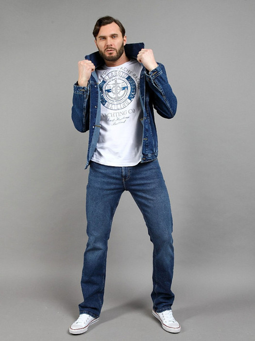 Мужские классические джинсы с пятью карманами. Посадка Slim fit (облегающие по бедру), средняя высота талии. Застежка на молнии. Немного зауженные к низу. Выполнены из слабоэластичной ткани denim comfort stretch. Светлая стирка со слабовыраженными  потёртостями и "усами" спереди и потёртостями сзади. Параметры указаны для размера 32. Длина внутреннего шва  - 86,0 см.