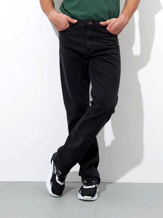 Мужские модные джинсы с пятью карманами. Посадка Regular fit (полуоблегающие по бедру), высокая талия. Застежка на молнии. Выполнены из слабоэластичной ткани denim comfort stretch, цвет ткани Black/Black (лицевая и изнаночная стороны ткани черные). Темная стирка с потёртостями  только по швам.