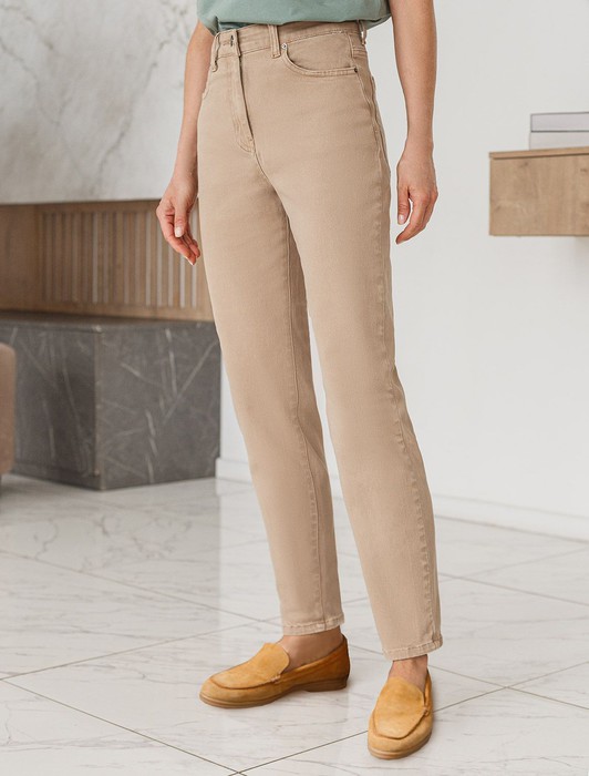 Состав: 98%Хлопок 2%ПУ Плотность: 12.5 OZ Параметры модели на первом фото: Рост 170, бюст 89, талия 63, бедра 92 Размер товара на первом фото: 42Джинсы mom-fit выполнены из эластичного тонкого денима. Модель в бежевом оттенке хорошо впишется в непринужденный повседневный образ с вещами и нейтральной, и яркой гаммы. Комфортная посадка на талии подходит для любой фигуры, ткань хорошо тянется и не сковывает движений. Изделие дополнено патчем из эко-кожи с логотипом бренда.