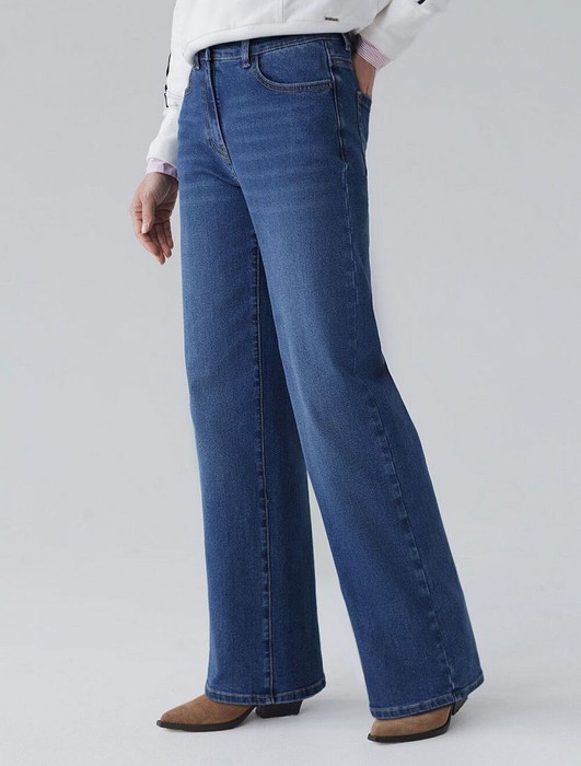 Стильные джинсы трубы синего цвета цвета прямого кроя выполнены из эластичного облегченного денима, что делает их особенно удобными для повседневной носки. Легкая декоративная стирка добавляет интересный акцент и подчеркивает современный дизайн. Джинсы правильного кроя визуально вытягивают силуэт, благодаря эластану в составе аккуратно садятся на любую фигуру, подчеркивая достоинства и обеспечивают максимальный комфорт в течение дня, не сковывая движения. Широкая размерная линейка подходит для разных типов фигур: свободные джинсы комфортны как для обладательниц пышных форм, так и для худеньких. Вы сможете подабрать джинсы на низкий или высокий рост. Джинсы идеально держат форму даже при активном движении и не вытягиваются после долгой носки. Качественная надежная фурнитура делает эти джинсы премиальными. Широкий подгиб добавляет актуальности — такой тренд отлично сочетается как с обувью на каблуке, так и на плоском ходу. Благодаря универсальному дизайну джинсы легко комбинируется с разными элементами гардеро