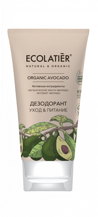 Дезодорант ECOLATIER® Organic Avocado на основе натуральных компонентов особенно бережно ухаживает за кожей, защищает от неприятного запаха, дарит легкий аромат, обеспечивает свежесть и комфорт. Не оставляет следов на одежде. Натуральное и безопасное средство. Содержит максимум ингредиентов натурального происхождения.