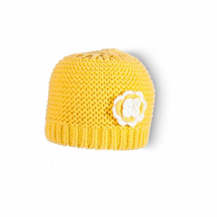 Шапка детская трикотажная без отворота, со стянутым верхом, однотонная, с крупным объемным переплетением чередованием лицевых и изнаночных петель, с отделочной деталью сбоку в виде цветка.