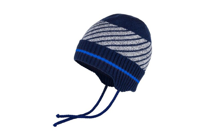 Теплая шапочка с хлопковой подкладкой, завязками и удобными наушниками для защиты от холода и ветра. шапочка выглядит стильно благодаря оригинальному переплетению.представлена в двух цветовых вариантах: синий и серый.