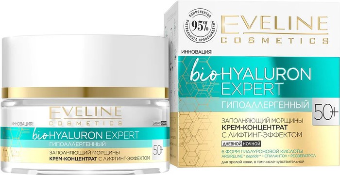 ЗАПОЛНЯЮЩИЙ МОРЩИНЫ КРЕМ-КОНЦЕТРАТ С ЛИФТИНГ-ЭФФЕКТОМ 50+, обогащенный шестью формами гиалуроновой кислоты, оказывает отличное влияние на кожу, а именно: