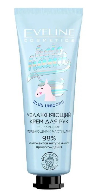 Нежно-голубая голографическая пыльца увлажняющего крема для рук Holohand с голографическим эффектом и мерцающими частичками волшебным образом заботится о твоих руках/