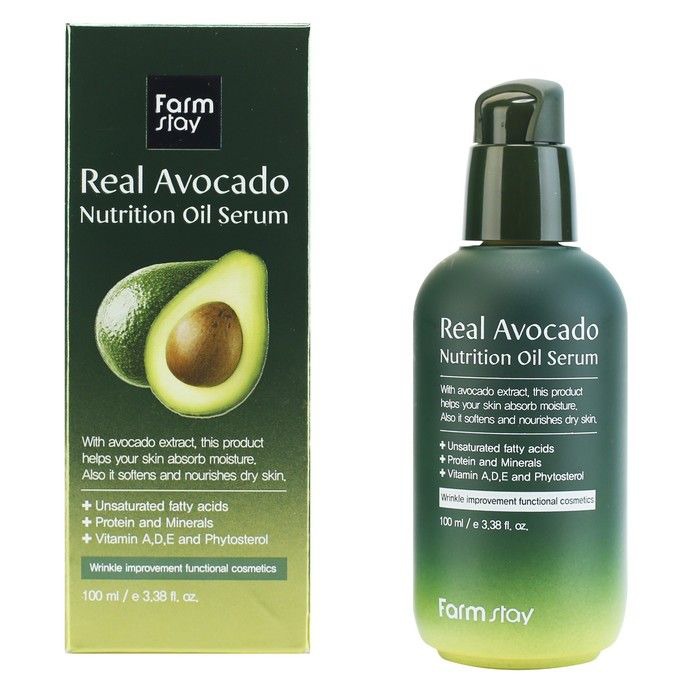 Основным активным компонентом сыворотки стало масло авокадо в концентрации 0,1%. Масло авокадо – природный источник ненасыщенных жирных кислот, которые восстанавливают и укрепляют защитный барьер кожи, при этом не провоцируя акне.Также авокадо содержит важные для кожи витамины А, D и Е, минералы, протеины и фитостеролы. Масло повышает эластичность и плотность кожи, защищает клетки от свободных радикалов, помогает удерживать влагу в глубоких слоях эпидермиса. Также в составе сыворотки – экстракты зелёного чая и центеллы азиатской. Они активизируют заживление микротравм и ранок, борются с воспалениями, раздражениями и сухостью. Экстракт красного женьшеня ускоряет микроциркуляцию крови, поэтому все процессы в эпидермисе протекают быстрее, а ингредиенты косметики работают более эффективно. Сыворотка FarmStay Real Avocado Nutrition Oil Serum имеет нежную и лёгкую текстуру, мгновенно впитывается и не оставляет жирного блеска на лице.