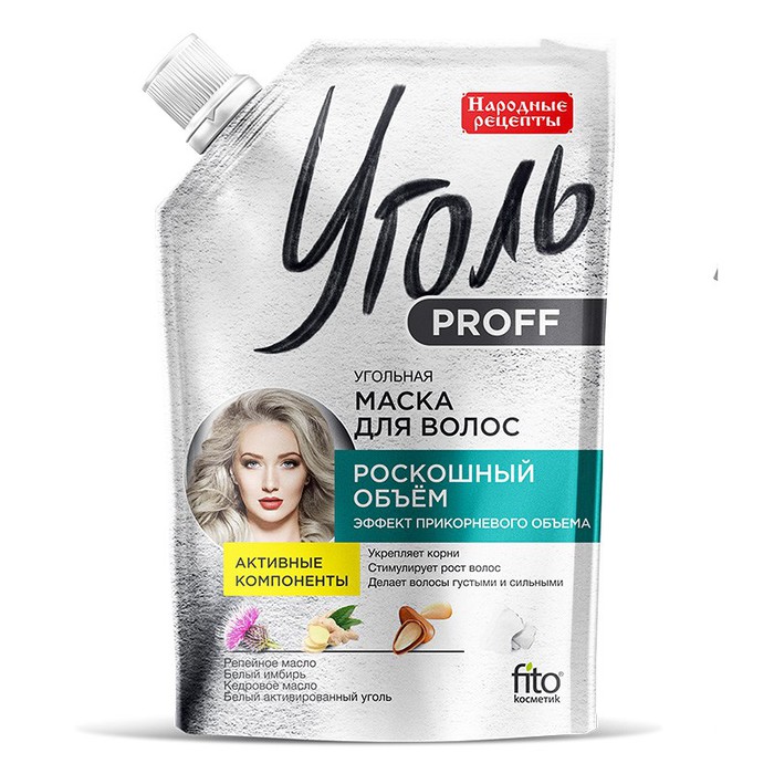 Угольная маска для волос Роскошный объём с эффектом прикорневого объёма активно стимулирует рост волос и повышает их плотность. Белый активированный уголь бережно и без утяжеления окутывает волосы невидимой защитной плёнкой, питает волосяные луковицы и мгновенно увеличивает прикорневой объём.