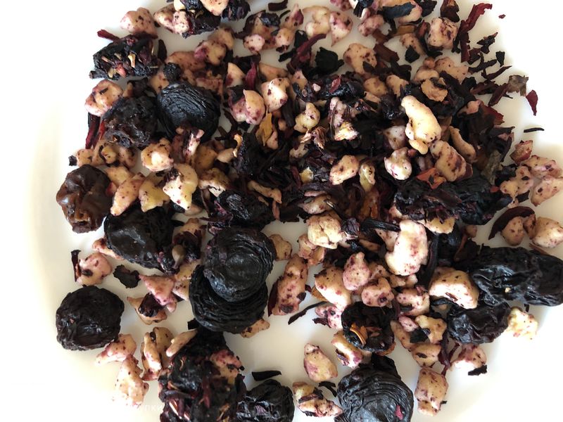 Ещё не открыв пакетик уже чувствовала аромат этого чая)))) обычно когда пишут что чай с гибискусом, то ожидаешь что его будет много и фруктов где-то 10-20%. А тут была удивлена, фруктов очень много, присутствует целая вишня, кусочков яблока очень много, а гибискуса немного. Такой чай и на подарок можно заказать.