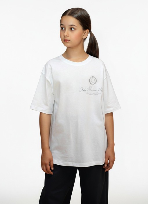 Футболка для девочки из трикотажного полотна "кулирка" с приспущенным плечом, втачными короткими рукавами, горловиной овальной формы, обработанной втачной планкой и принтом на полочке, выполненным в технике шелкографии. По шву втачивания планки в горловину настрочена отделочная строчка.