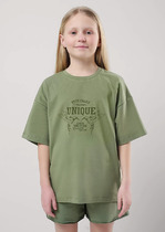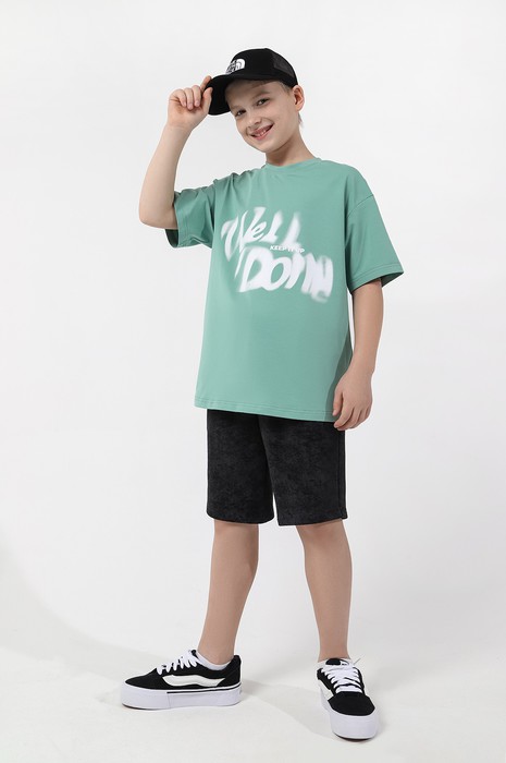 Футболка оверсайз для мальчика из трикотажного полотна: хлопкового с добавлением лайкры. Модель с принтом на переде, спущенной линией плеч, рукавами длиной до локтя.