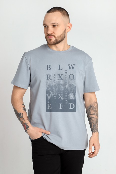 Футболка мужская из гладкокрашеного трикотажного полотна "кулирка" с лайкрой, классическогоь покроя, с коротким втачными рукавами, горловиной овальной формы, обработанной втачной планкой и принтом на полочке, выполненным в технике шелкографии.