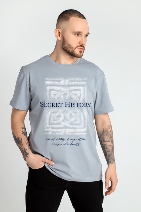 Футболка мужская из гладкокрашеного трикотажного полотна "кулирка" с лайкрой, классическогоь покроя, с коротким втачными рукавами, горловиной овальной формы, обработанной втачной планкой и принтом на полочке, выполненным в технике шелкографии.