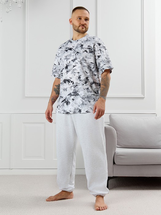Футболка из полотна с набивным рисунком эксклюзивного дизайна. Модель свободная, со спущенной линией плеч, овальным вырезом горловины.