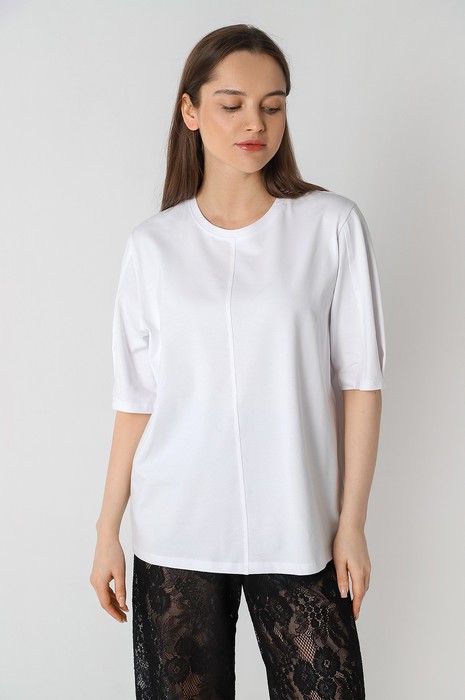 Футболка женская модной объемно-силуэтной формы, с вертикальным отстроченным швом по центру переда. На рукавах выполнены глубокие защипы по низу и также вертикальные отстроченные швы.