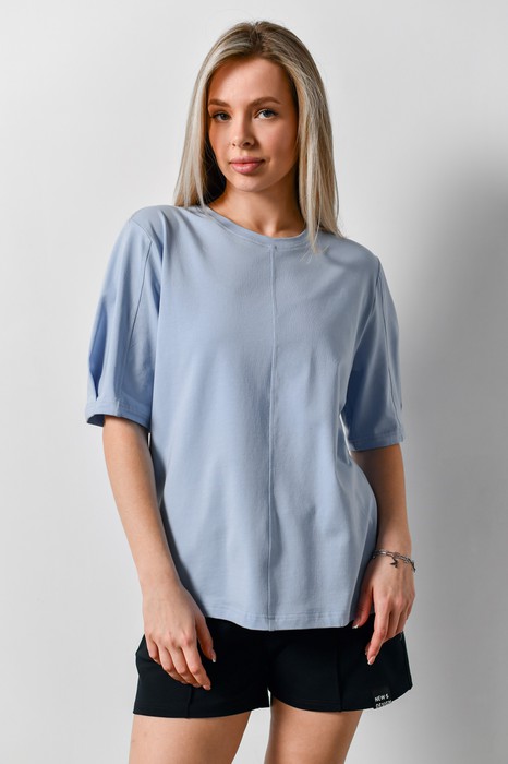 Футболка женская модной объемно-силуэтной формы, с вертикальным отстроченным швом по центру переда. На рукавах выполнены глубокие защипы по низу и также вертикальные отстроченные швы.