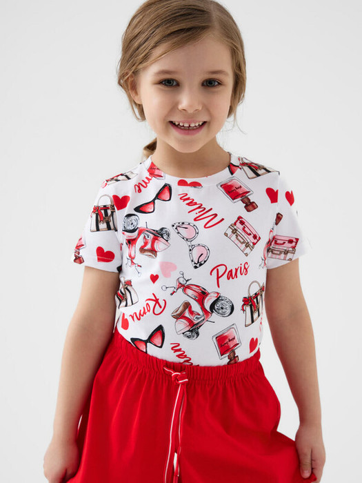 Детская футболка для девочки. Модель прямого кроя, выполнена из эластичного хлопкового трикотажа джерси. Яркие принты. Горловина круглая.