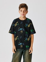 Трикотажная футболка, декорированная контрастным прорезиненным принтом с деталями из блесток и пайеток спереди. Свободный крой, круглый вырез горловины, слегка удлиненная спинка.На ребенке представлен размер 140:- Ширина изделия по линии груди 41 см- Ширина по низу изделия 40 см- Длина изделия 53 смРазница между размерами составляет 1,5 см.