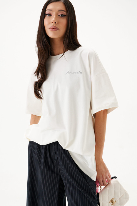 Футболка прямого свободного кроя, выполнена из хлопкового полотна. Характеристики: прямой свободный крой, горловина овальная, рукав слегка спущен, горловина и край рукава выполнены из довяза, по передней части изделия слева декоративная объемная печать "Annete". Длина по центру спинки 69 см, длина рукава 18 см.