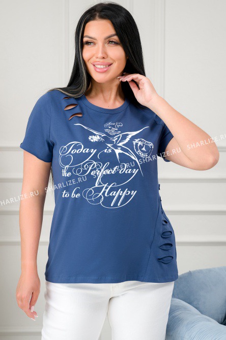 Необычная футболка, с разрезами на плече и боковой части модели. Футболка светлого оттенка индиго. Модель свободного силуэта, плавно расширяется к низу, что позволяет чувствовать свободу и легкость применения.