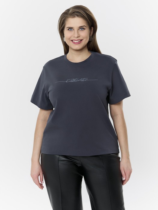 Футболка молодежная из гладкокрашеного трикотажного полотна «кулирка с лайкрой», свободного покроя, с втачными короткими рукавами, широкой подгибкой по низу изделия и нижним срезам рукавов. На полочке выполнена печать в технике «шелкографии». Горловина овальной формы обработана втачной планкой с отделочной строчкой по шву притачивания.
