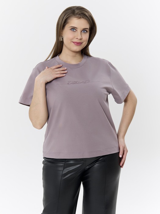 Футболка молодежная из гладкокрашеного трикотажного полотна «кулирка с лайкрой», свободного покроя, с втачными короткими рукавами, широкой подгибкой по низу изделия и нижним срезам рукавов. На полочке выполнена печать в технике «шелкографии». Горловина овальной формы обработана втачной планкой с отделочной строчкой по шву притачивания.