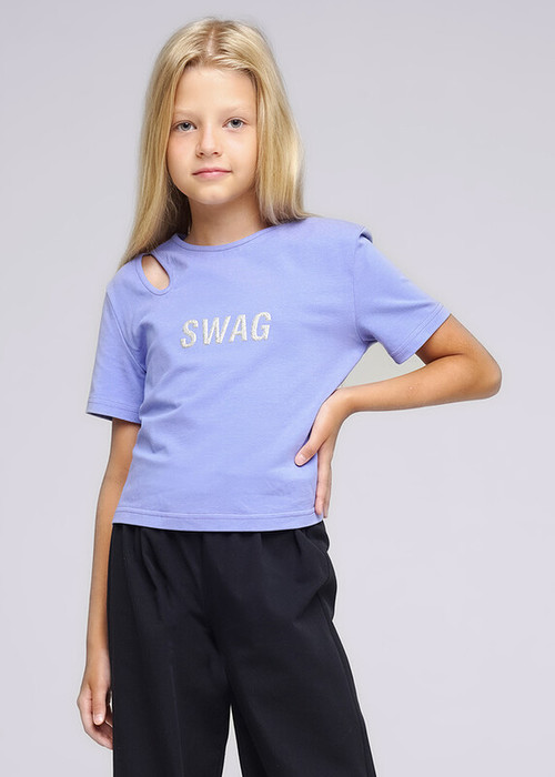 Трендовая футболка с вырезом на плече из хлопкового трикотажа с эластаном. Модель дополнена акцентной термаппликацией с глиттером. Умеренный объем, круглый вырез горловины, короткий рукав.