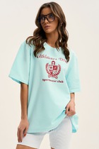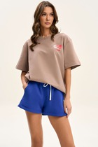 Джемпер выполнен из трикотажного полотна в виде футболки покроя "oversize", длиной ниже линии бедер. Горловина округлой формы, обработана бейкой. Плечевой шов спущен. Рукав одношовный, длиной до линии локтя.