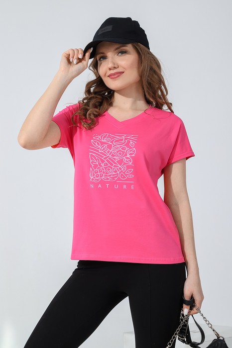 Футболка – с короткими цельнокроеными рукавами, V-образным вырезом горловины, обработанным втачными планками, заходящими друг на друга спереди, и принтом на полочке.