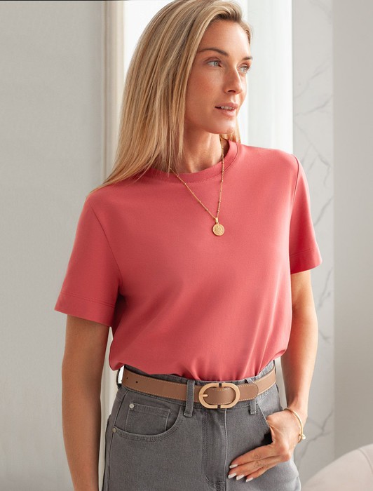 Состав: 92%Хлопок 8%ПУ Плотность: 170 Г/м2 Параметры модели на первом фото: Рост 172, бюст 88, талия 64, бедра 88Базовая однотонная футболка из премиального хлопка. Горловина выполнена из рибаны в тон изделия, Добавление эластана в состав изделия способствует формоустойчивости. Самое высокое качество хлопковых волокон обеспечивает комфорт в любое время года. Идеально держит форму и сохраняет внешний вид в течение долговременного использования. Универсальная базовая вещь для ваших стилистических решений. Изделие дополнено металлическим логотипом бренда на рукаве.