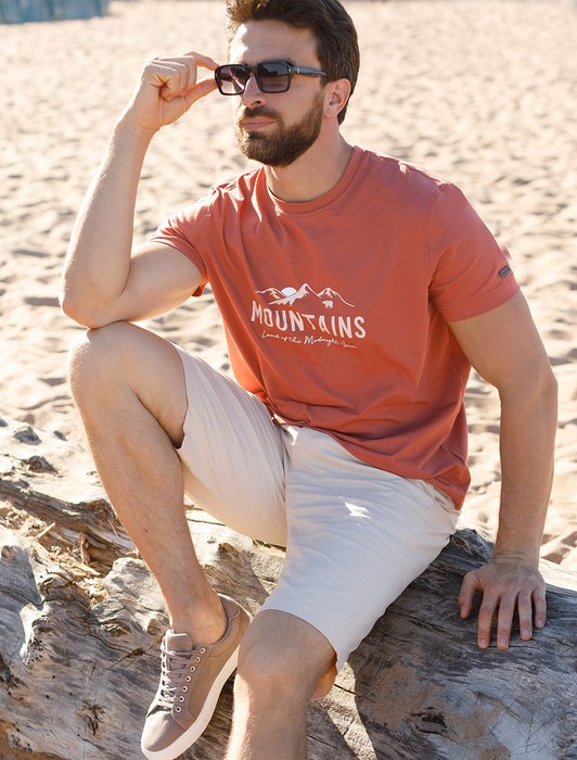 Состав: 92%Хлопок 8%ПУ Плотность: 170 Г/м2 Параметры модели на первом фото: Рост 190, бюст 108, талия 87, бедра 104 Размер товара на первом фото: 54Перевод принта: Mountains, land of the midnight sun - горы - страна полуночного солнца. Футболка выполнена из премиального хлопка с эластаном. Авторский принт нанесен фактурными красками с устойчивым покрытием. Изделие комфортно сидит по фигуре, не сковывая движений. За счет среднего объема, хорошо подойдет как первый слой под пиджак, кардиган или бомбер. На рукаве нашивка из эко-кожи с логотипом бренда.